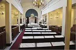 Unter einer großen Arkade, auf deren Bogen eine hebräische Inschrift angebracht ist, steht der von einer bestickten, roten Parochet verhüllte Toraschrein. Die Bima befindet sich – wie in orthodoxen Synagogen üblich – in der Mitte des Raumes. Die gesamte Innenausstattung, wie die Holzbänke und ein Teil der Leuchter, ist noch original erhalten, ebenso eine Uhr, bei der anstelle von Ziffern hebräische Schriftzeichen stehen. Unter der Empore am Eingang erinnert eine Tafel aus Marmor an die Gefallenen der Gemeinde im Ersten Weltkrieg. Eine andere Tafel erinnert an die Opfer der Shoa, darunter sehr viele deutsche Namen: Bamberger, Berger, Durlacher, Felber, Fuldauer, Rosenberg, Schlachter, Schlesinger, Schwarz, Wassermann.