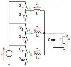 Für höheren Leistungen können mehrere Synchronwandler parallel betrieben werden. Dabei können sie im Gleichtakt oder mit versetzten Phasen anzusteuert werden. Die verteilte Energieaufnahme und -abgabe der getrennten Induktivitäten verschafft bei gegebener Anforderung an die Spannungswelligkeit einen Spielraum, der genutzt werden kann zur