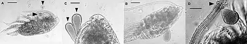 • Verschiedene Ruderfußkrebse der Familie Para­calanidae, infiziert von Ello­biopsis chattonii. (A,B) Para­calanus indicus mit an­haftenden Para­siten. (C,D) Parvo­calanus crassi­rostris mit diesem Para­siten.