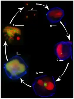 Lebenszyklus von Amoebophrya spp. (grün) und ihrem Wirt Alexandrium fundyense (Pyrocystaceae, blau/rot).