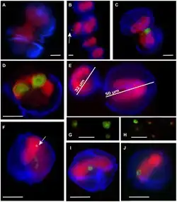 FISH-Aufnahmen von Amoebo­phrya sp. (grün), freischwimmende Dinosporen[5] und im Wirt Akashiwo sanguinea (blau/grün).