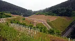 Die andere große Aufschüttung im Tal, ein ca. 64 m hoher Bahndamm, auf dem die Bahnlinie dann zum vierten Mal den Lauf des Tälesbachs überquert, riegelt das Tal bis zur Höhe der Dammkrone zu einem Talkessel ab. Aus ihm leitet ein etwa zwei Meter hoher Tunnel den Bach aus; vor wie nach ihm läuft der Tälesbach über mehrere hundert Meter kanalisiert in einem Betonbett.