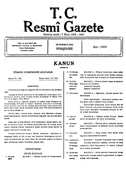 | Amtsblatt: | Nr. 10859 v. 20. Juli 1961, S. 4641 ff., resmigazete.gov.tr (PDF; 3,38 MB) |