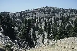 - Im östlichen Hinterland das Eyre-YüğIük-Bergland: Diese östlichen Partien des Taşeli-Plateaus umfassen die höheren, stark verkarsteten Kammregionen der Taşeli-Hochfläche südöstlich von Karaman mit oft weiten kahlen Kalkflächen z. B. in Umfeld und Vorland des 2474 m hohen Yüğlük Dağı.