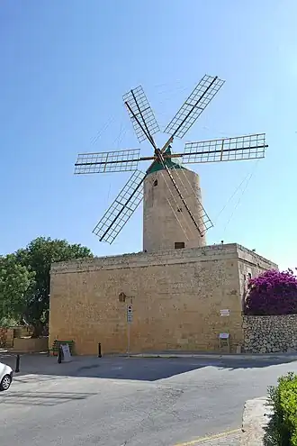 Die Bauweise folgt der im maltesischen Archipel üblichen Form der Turmwindmühle mit einem die Basis umgebenden Müllerhaus.[1] Ursprünglich besaß die Windmühle wohl keine Nachführung, denn es wird berichtet, dass der Müller in ein Tritonshorn blies, sobald der Wind günstig stand, damit die Menschen in der Umgebung ihr Getreide zum Mahlen in die Mühle brachten.[2] Der rezente Befund deutet auf eine später eingebaute Nachführung mittels auf der verlängerten Achse angebrachten Segeln hin.