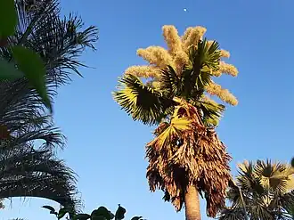 Der Blütenstand befindet sich oberhalb der Blätter endständig am Stamm. Er ist rund 4 m lang und setzt sich aus mehreren Blütenständen zusammen. Jeder der Teilblütenstände ist dreifach verzweigt. Alle Seitenachsen enden in blütentragenden Achsen (Rachillae).