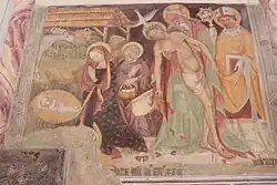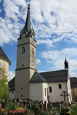 Die Pfarrkirche Mariae Himmelfahrt und hl. Valentin ist ein im Kern gotischer Bau des frühen 15. Jahrhunderts mit einem mächtigen Nordturm mit Spitzhelm. Sie erhielt nach einem Brand 1660 und zwischen 1756 und 1780 eine neue Fassade sowie an der Nordseite einen Sakristeianbau. Nach einem weiteren Brand im Jahr 1853 wurde sie im neugotischen Stil renoviert. 1996 wurde das Steinplattldach neu gedeckt und 1998 die Altäre restauriert.[5] Deckenfresko von Eustachius Gabriel.