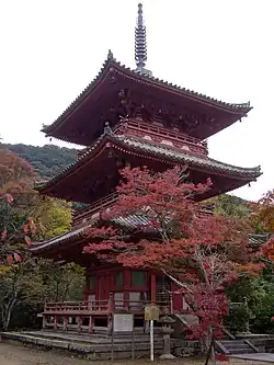 Die Dreistöckige Pagode (三重塔, Sanjū-no-tō) rechts neben der Haupthalle stammt aus dem Jahr 1688 und ist als wichtiges Kulturgut der Präfektur registriert. Sie hat gestaffelte Dächer, die sich – im Unterschied zu alten Pagoden – kaum in der Größe unterscheiden, was typisch für die Edo-Zeit ist. Im Erdgeschoss wird ein Kongōkai Dainichi Nyorai (金剛大日如来) verehrt, der von den Vier Himmelskönigen geschützt wird. Der Andachtsraum ist nicht für die allgemeine Öffentlichkeit zugänglich.