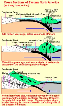 Die Takonischen Berge wurden durch die Aufschiebung des durch die Ozeanbodenspreizung des Iapetus-Ozeans entstandenen vulkanischen Inselbogens auf den Kraton bzw. Kontinentalkern Laurentias gebildet. Diese Entwicklung ist mit der heutigen Situation der Japanischen Inseln am Pazifischen Feuerring vergleichbar.