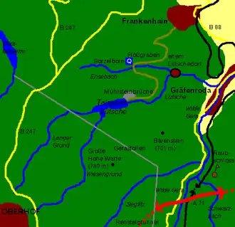 - Borzelborn, Quelle beim Ortsteil Frankenhain, ca. 1 km östlich der Lütschetalsperre