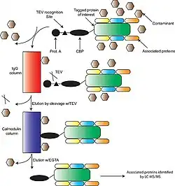 Ab dem Jahr 1999 wurden Tandem Affinity Purification Tags für Proteine entwickelt, welche aus zwei verschiedenen, aufeinander folgenden Protein-Tags bestehen.[3][4] Dessen äußeres (N- oder C-terminales) Protein-Tag wird in der ersten Säule nach Entfernung unerwünschter Bestandteile aus dem Zellaufschluss durch die Protease TEV gespalten, wodurch das gewünschte Protein (ohne sein äußeres Protein-Tag), die TEV-Protease und einige restliche Kontaminationen von der Chromatographiesäule eluieren. Die TEV-Protease aus dem Tobacco Etch Virus hat eine längere Erkennungssequenz (Glu-Asn-Leu-Tyr-Phe-Gln-(Gly/Ser) bzw. ENLYFQ(G/S)), um das aufzureinigende Protein nicht an anderen Stellen zu zerschneiden. Meistens wird zur Entfernung der TEV-Protease und restlicher Kontaminationen als zweites, innenliegendes Protein-Tag das CaM-Tag oder ein Biotin-basiertes Tag verwendet, da deren Elutionsbedingungen nicht denaturierend sind und die Bestandteile des Elutionspuffers (EGTA bzw. Biotin) wenig bei einer folgenden Verwendung stören.