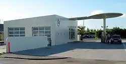 Der eingeschossige, viereckige Bau ist außen mit weißen Fliesen in vertikaler Ausrichtung verkleidet. An der Nordseite befinden sich zwei Garagentore, durch die Autos in die Werkstatt fahren konnten. Nur die Westseite hat Fenster und Türen, durch die der Kassenbereich betreten wird. Neben der Fensterfront befindet sich an der Fassade eine Uhr, die nachts rot beleuchtet ist und erst später montiert wurde. Das runde, pilzförmige Dach mit einer einzigen Mittelsäule aus Beton ist an seiner Unterseite weiß lackiert und wird von drei Scheinwerfern über dem Zugang des Gebäudes und vier Scheinwerfern an der Mittelsäule angestrahlt. Durch diese Konstruktion wird der Tankbereich indirekt beleuchtet. Das Dach hat an der Straße seinen höchsten Punkt und fällt gleichmäßig zur Rückseite ab.
