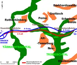 Die Ersatzneubaustrecke selbst gehört zu einem 7,9 Kilometer langen Planungsabschnitt zwischen Betriebskilometer 31,5 und 23,6[10], in dem neben drei Talbrücken auch acht kleinere Über- oder Unterführungsbauwerke nötig waren. Sie umgeht das Tanneberger Loch knapp nördlich auf der Hochfläche. Dies vermindert das Gefälle von 6 auf maximal 1,8 Prozent. Die Linienführung wurde begradigt, großzügige Kuppen- und Wannenausrundungen vorgenommen und die Kurvenradien vergrößert. Insgesamt wurden beim Bau rund eine Million Kubikmeter Erde bewegt, wobei sich die Abtragsmengen in Einschnitten ungefähr mit den Auftragsmengen bei Dämmen ausglichen. Zur Sammlung und Reinigung des Oberflächenwassers der Fahrbahn entstanden zehn Regenrückhaltebecken.[4] Die neue Trasse ist nicht mehr vierstreifig ausgeführt, sondern enthält sechs Fahrspuren plus Standstreifen. Die Baukosten betrugen insgesamt 131 Millionen DM (rund 67 Millionen Euro). Davon entfielen allein 60 Millionen DM[5] (rund 31 Millionen Euro) auf die drei großen Talbrücken über das Triebischseitental des Schmiedewalder Dorfbachs, die Triebisch selbst und den weiter westlich gelegenen Tännichtbach. Sie bestehen jeweils aus zwei getrennten Überbauten, die längs und quer beschränkt vorgespannt sind.