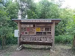 Das Insektenhotel im Tannenbühl befindet sich zwischen dem Vogelhaus und dem Wildschweingehege; daneben steht eine informative Tafel, die über die verwendeten Materialien und deren Eignung für verschiedene Insektenarten aufklärt.⊙