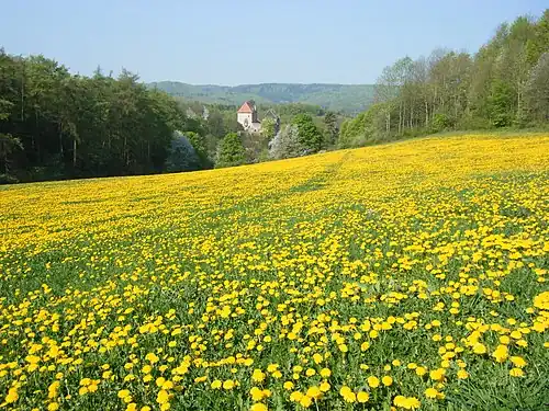 ![]() Blick von Osten auf das Landschaftsschutzgebiet mit der Tannenburg. | ||