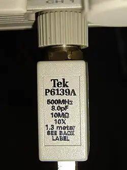 Manche Tastköpfe haben neben dem Stecker einen Kontaktstift, der durch seine Position dem Oszilloskop das Teilungsverhältnis mitteilt.[4] In Folge wird der Spannungs-Messbereich umgerechnet. Diese Funktion steht in der Regel nur zur Verfügung, wenn Tastkopf und Oszilloskop von demselben Hersteller kommen und beide Geräte die Funktion unterstützen.
