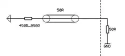 Bei einem Transmission-Line-Tastkopf wird zwischen Tastkopfleitung und Oszilloskop Anpassung hergestellt. D. h. das Oszilloskop arbeitet mit einer Impedanz von 50 Ω, und die verwendete Zuleitung hat einen Wellenwiderstand von ebenfalls 50 Ω. Zwischen Messspitze und Zuleitung wird ein Widerstand von 450 Ω (bei Teilung 10:1) oder 950 Ω (bei Teilung 20:1) geschaltet.