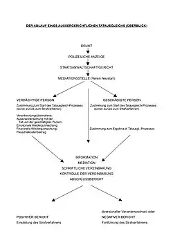 1985 begann ein Modellversuch[1] des außergerichtlichen Tatausgleichs für Jugendliche in Wien, Linz und Salzburg, zunächst nur für wenige Deliktarten, z. B. Sachbeschädigungen. Im Mittelpunkt des inhaltlichen Konzepts stand die Aktivierung der betroffenen Jugendlichen, die Aufwertung der Geschädigten und das Bemühen, die Strafjustiz in Richtung eines Selbstverständnisses als sozial friedensstiftende Institution zu bewegen. Darüber hinaus wurde die Freiwilligkeit der Mitarbeit der Betroffenen betont. Die Ergebnisse des Modellversuchs ergaben eine Ausweitung der behandelbaren Delikte z. B. auf leichte Körperverletzung. Delikte, bei denen keine konkreten Personen als Geschädigte vorhanden waren, sondern z. B. Firmen, erwiesen sich als wenig geeignet. Mit 1989 wurde eine rechtliche Verankerung im Jugendstrafrecht (§§ 6–7 JGG) geschaffen, und der außergerichtliche Tatausgleich für Jugendliche österreichweit angeboten. Bis zur Eröffnung einer Hauptverhandlung konnten jetzt die Jugendstaatsanwaltschaft oder die Richter geeignete Fälle dem Außergerichtlichen Tatausgleich zuweisen.