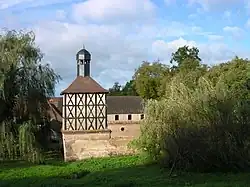 Der rechteckige Taubenturm an der Südostecke der Ummauerung ist in Fachwerkbauweise ausgeführt. Er wird von einer Laterne, die mit Schiefer gedeckt ist, bekrönt. Das Fachwerk weist viele Andreaskreuze auf. Im Inneren ist die drehbare Holzleiter erhalten, die genutzt wurde, um die circa 200 Nester zu reinigen.