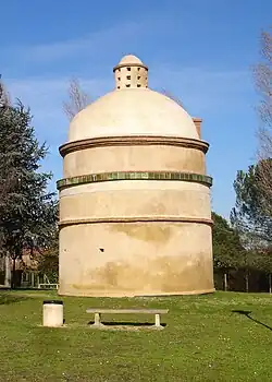 Der runde Turm aus verputztem Ziegelmauerwerk wird von einer Kuppel gedeckt, die von einem kleinen Aufbau bekrönt wird. Dieser weist Öffnungen für die Tauben auf.