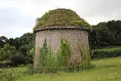 Der runde Taubenturm aus Hausteinmauerwerk besitzt ein Dach, das aus dem gleichen Stein ausgeführt ist wie das Mauerwerk.