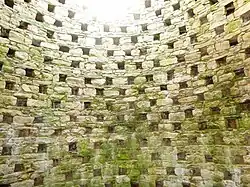 Der runde Taubenturm aus Bruchstein hat eine Tür mit Hausteinrahmung. Das Dach ist aus dem gleichen Stein ausgeführt wie das Mauerwerk.
