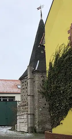 Der große unverputzte Turm wurde im 18. Jahrhundert in massiver Bauweise ausgeführt und auf annähernd quadratischem Grundriss errichtet. Bedeckt wird er von einem Spitzhelm, der mit einer Wetterfahne bekrönt ist.