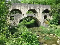 Die oberen neun Bögen sind nicht genau auf die unteren Bögen abgestimmt, sondern bilden eine eigene Reihe auf den unteren Bögen. Es sind Kreisbögen mit lichten Weiten zwischen 5,8 m und 6,2 m; die Pfeilhöhe wächst mit der Straßengradiente von 2,3 m auf 3,0 m. Die 45 cm dicken Brüstungen sind 126 m[2] lang. Früher hatte die Brücke eine Breite von 5,4 m, seit dem Wiederaufbau 1956 ist sie 6,4 m breit.