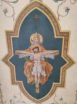 Das Bauwerk ist eine flachgedeckte Saalkirche mit eingezogenem, gewölbtem Chorraum, die als Putzbau mit Ziegeldach und verblechtem Dachturm ausgeführt ist. Im Innern fällt die fein ausgeführte Wand- und Deckenbemalung (mit einer Darstellung des Gnadenstuhls) auf. Die Spitzbogenfenster der Apsis sind mit zwei farbigen Glasmalereien aus der Bauzeit versehen, die heilige Bischöfe darstellen. Der wie eine Anrichte gestaltete Altar ist mit einem Aufsatz versehen, der in den Füllungen geflügelte Engelsköpfe zeigt. Er wird von einer Darstellung von Maria mit Christus in der Art einer Pietà bekrönt.