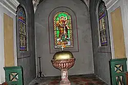 Das 1,10 Meter hohe Taufbecken in der Taufkapelle steht auf einem rechteckigen Sockel mit Säule. Das runde Becken mit einem Durchmesser von einem Meter ist am oberen Rand profiliert und an seiner Wölbung godroniert.