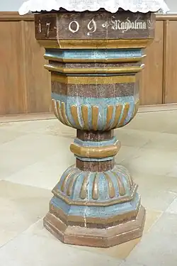 Das Taufbecken aus Kalkstein, mit der typischen Godronierung im Stil des Barocks, hat am oberen Rand die Jahreszahl 1709 und die Stifternamen Magdalena Lindenmayer und Hans Georg Lindenmayer aufgemalt.