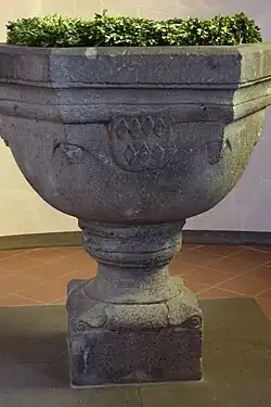 Das Taufbecken in der katholischen Pfarrkirche St. Nikolaus und St. Rochus in Mayschoß, einer Ortsgemeinde im Landkreis Ahrweiler in Rheinland-Pfalz, wurde im 16. Jahrhundert geschaffen.