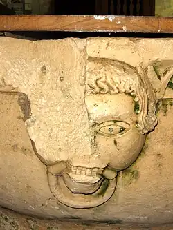 Das 55 cm hohe Taufbecken aus Kalkstein steht auf einem rechteckigen Sockel aus neuerer Zeit. Das ovale Becken wird von einem Fries mit Pflanzenmotiven und zwei menschlichen Köpfen geschmückt, von denen einer einen Ring im Mund hält.