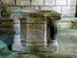 Das 67 cm hohe Taufbecken aus Kalkstein steht auf einer rechteckigen Basis, auf der an den vier Ecken Säulen mit einfachen Blattkapitellen stehen. Das achteckige Becken ist mit einem Fries geschmückt.