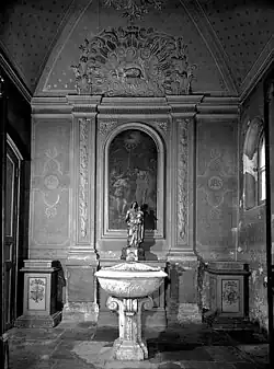 Das Taufbecken aus weißem Marmor steht in der Taufkapelle. Auf einem rechteckigen Sockel mit Pfeiler tragen dessen vier Voluten das runde Becken. Es ist mit pflanzlichen Motiven verziert.
