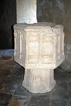 Das 1,22 Meter hohe Taufbecken, das aus einer zerstörten Kapelle stammt, steht auf einer polygonalen Basis, die mit Bändern verziert ist. Das sechseckige Becken wurde aus einem Steinblock geschaffen. Die Verzierungen an allen Seiten erinnern an gotische Maßwerkfenster.