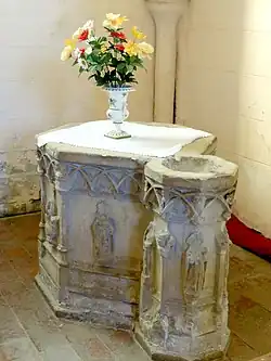 Das 89 cm Taufbecken aus Kalkstein ist aus einem Steinblock gearbeitet. Es ist achteckig und reich mit Reliefs verziert, die aus Säulen, Bögen, Dreipässen und pflanzlichen Motiven bestehen. Auf den Flächen zwischen den Säulen sind die Taufe Jesu, die heilige Margareta von Antiochia, weitere Heilige und Engel dargestellt. Teile der Reliefs fehlen.