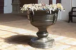 Zwischen den Figuren ist folgender Schriftzug eingraviert: „qui credederit et baptisatus fuerit salvus erit“ (Wer geglaubt hat und getauft ist wird erlöst, (Markus 16,16 )).