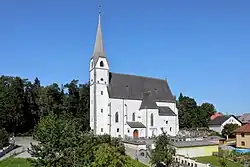 - Eine auf einem Hügel situierte gotische Kirche, die nach der Mitte des 15. Jahrhunderts vermutlich durch den Baumeister Stephan Krumenauer erbaut wurde. Der Turm stürzte 1922 ein und wurde 1923 in der alten Form wieder aufgebaut.
