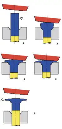 Das Werkstück wird in ein Gesenk eingelegt, das es von unten fixiert. Dieses Gesenk ist auf dem festen Teil einer Taumelpresse eingespannt. Von oben wird mit einem oder mehreren drehenden Gesenken nacheinander das Werkstück kalt umgeformt. Das obere Gesenk ist zu seiner Drehachse um einen bestimmten Winkel schräg gestellt. Dadurch ergibt sich eine Walzbewegung, unter der das Metall des Werkstücks in seine neue Form fließen kann.