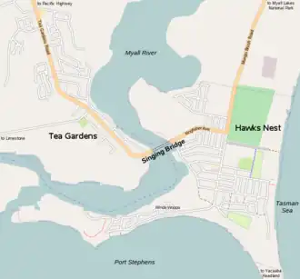 Im Jahr 1921 wurden die ersten Besiedlungsflächen in Tea Gardens und Hawks Nest öffentlich ausgewiesen. Ein Fährbetrieb zwischen den beiden Orten nahm 1928 den Betrieb auf. Jedoch erst mit dem Beginn von kommerziellem Sandabbau in der Gegend in den 1960er Jahren begannen die beiden Orte wieder an Bedeutung zu gewinnen. Es wurden Touristenstraßen gebaut und 1974 ersetzte die Singing Bridge den Fährbetrieb.[4]