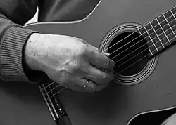 Anders als es der Begriff "Nagelspiel" vermuten lässt, beschränkt sich diese Anschlagsform keineswegs auf das ausschließliche Zupfen mit dem Nagel. Vielmehr ist das Nagelspiel eine Kombination von Kuppen- und Nagelanschlag, bei der die Saite zunächst über die Fingerkuppe gleitet und dann erst Kontakt mit dem Nagel hat. Das richtige Feilen der Fingernägel erfordert viel Übung und Experimentieren, da es zum einen gilt, die für den Nagel ideale Bogenform zu finden und zum anderen den Fingernagel ausreichend zu polieren, damit schabende und kratzende Geräusche vermieden werden.