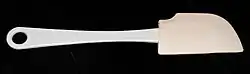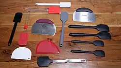 Teigschaber mit Stiel nennt man auch Teigspatel, mit einem Aufsatz aus Gummi oder weichem Kunststoff auch Gummischaber. Teigspatel bestehen aus einer biegsamen, rechteckigen Platte, meist aus Gummi oder Silikon, mit einem Stiel aus Plastik, Holz oder Edelstahl. Silikon-Teigspatel sind wegen ihrer Hitzebeständigkeit auch für heiße Massen wie Karamell geeignet.