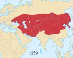 Als Möngke Khan 1259 während des Feldzuges gegen die chinesische Song-Dynastie bei der Belagerung der Diaoyu-Festung ums Leben kam, war noch kein Nachfolger bestimmt. Mit seinem Tod endete das einheitliche Mongolische Weltreich[2]. Die territoriale Ordnung zu diesem Zeitpunkt:
