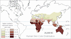 Teilweise korreliert die Hautfarbe mit der geographischen Region in der Weise, dass die Pigmentierung umso stärker ist, je höher die UV-Strahlung ist. Im Jahr 2000 stellten Nina Jablonski und George Chaplin eine Theorie auf, die sich insbesondere auf die Vor- und Nachteile eines hohen beziehungsweise niedrigen Melaninspiegels beruft.[9] Jablonski und Chaplin folgerten, möglicherweise seien im Zuge der Evolution nicht helle aus dunklen Hautfarben hervorgegangen, sondern helle und dunkle Hautfarben als Extremstufen der Anpassung aus einem eher ocker-farbigen Ausgangston ähnlich dem der San-Völker im heutigen südlichen Afrika.[8]