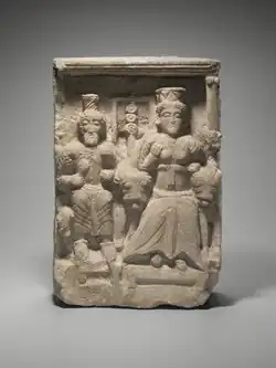 Der Tempel der Atargatis in Dura Europos ist einer der Haupttempel der antiken Stadt. Der Bau wurde im ersten nachchristlichen Jahrhundert, als die Stadt unter parthischer Herrschaft stand, errichtet und unter der Leitung von Maurice Pillet 1928–1929 ausgegraben.[1] Der Tempel liegt südlich des Zentrums (von den Ausgräbern als Agora bezeichnet) der Stadt und nimmt dort den nordöstlichen Teil des Häuserblockes H2 ein. Der Kultbau liegt nahe beim Tempel der Artemis Azzanathkona. Ein Relief auf dem Allerheiligsten des Tempels zeigt die Göttin Atargatis, auf beiden Seiten von Löwen flankiert und begleitet durch ihren Gemahl Hadad. Zwischen beiden, über dem linken Löwen, ist eine Kultstandarte abgebildet. Es handelt sich vielleicht um das Hauptkultbild im Tempel. Der Tempel besitzt einen Hof mit monumentalem Eingang und drei Allerheiligsten an der Rückwand sowie einem davor gelegenen Pronaos. Atargatis war die Gemahlin und Mutter des Adonis und des Hadad. Diesen Gottheiten gehörten vielleicht die beiden anderen der Naoi.[2] Es fanden sich auch Reste von Wandmalereien. Um den Hof finden sich diverse Räume, einige von ihnen mit Bänken den Wänden entlang. Einige dieser Räume werden als Kapellen für andere Gottheiten gedient haben, während es sich bei anderen Räumen um Speisezimmer für die Kultgemeinschaft handelte.