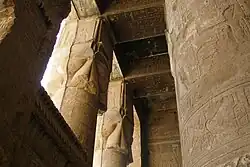 Die zweite Hypostylhalle hat sechs kleinere Säulen mit einem Schaftdurchmesser von 160 cm und Kompositkapitellen. Die Säulenbasis und die zwei unteren Säulentrommeln bestehen aus Granit, der Rest des Schafts und das Hathor-Kapitell aus Sandstein. Alle anderen Säulen des Tempels bestehen durchgehend aus Sandstein. Weitere Hathor-Kapitelle finden sich in der Wabet-Kapelle westlich des Barkensanktuars und auf dem Dachkiosk. Einige Hathor-Kapitelle der Dachkapelle tragen noch das vollständige Gesicht der Göttin, während die meisten anderen im Tempel von frühen Christen zerstört wurden.[13]