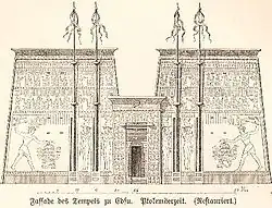 Beidseitig des Portals sind jeweils zwei senkrechte Aussparungen in der Fassade erkennbar, die der Aufnahme von Fahnenmasten mit farbigen Fahnen dienten. Zwischen ihnen befinden sich auf beiden Seiten je ein Relief des Hauptgottes des Tempels Hor-Behdeti („Horus von Edfu“) und seitlich zum Portal ein kleineres Relief der Göttin Hut-Hor-Iunet („Hathor von Dendara“), einer lokalen Form der Göttin Hathor des Ortes Dendara 130 Kilometer nördlich von Edfu. Die Götter blicken nach außen auf zwei Großreliefs an jeder Fassadenseite, wo ihnen der Pharao Ptolemaios XII. (Neos Dionysos) Gefangene als Opfer darbringt.[10] Vor dem Pylon stehen rechts und links des Tempeleingangs zwei Falkenstatuen aus schwarzem Granit. Diesen Horusdarstellungen fehlen heute ihre Kronen, die eine ähnliche Statue im Innenhof des Tempels noch trägt.