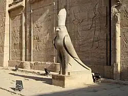 Der Tempel von Edfu war in ptolemäischer Zeit ein Ort wichtiger Feste zu Ehren der Götter des Horuskults. Neben dem Neujahrsfest feierte man hier jedes Jahr die Hochzeit des Horus von Edfu (Hor-Behdeti) mit der Hathor von Dendara (Hut-Hor-Iunet) sowie das Fest des Sieges von Horus über Seth aus dem Osiris- und Horusmythos. Im Tempel wurden auch lebende Falken in einem Vogelhaus, dem „Falkentempel“, aufgezogen, von denen man jährlich eines der Tiere im Tempelhof krönte und zum lebendigen Symbol des Horus machte. Von dem Vogelhaus sind keine Spuren mehr erhalten.[9]