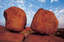 Devil’s Marbles – des Teufels Murmeln – heißen die merkwürdigen Felsformationen etwa 110 km südlich von Tennant Creek am Stuart Highway, die aus Tausenden verwitterter und verrundeter, zwischen 3 und 5 Meter hohen Granitfelsen bestehen. Die Kaytetye-Aborigines, die sie Karlu Karlu nennen, halten sie für die Eier der von ihnen verehrten Regenbogenschlange aus der Traumzeit. Der Ort ist ein bedeutender spiritueller Ort für die Kaytetye. Die verrundeten Felsen wurden über Jahrtausende von Wind, Sand, Temperaturunterschieden und Regen erodiert und so in ihre heutige Form gebracht.